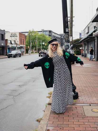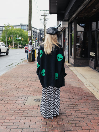 The Alien Superstar Oversized Knit Cardigan is cozy with a cosmic twist. A slouchy black knit covered in bold green alien graphics, it’s made for the girls who never really felt like they belonged on Earth anyway. Oversized, soft, and unapologetically weird—because being different is the vibe.