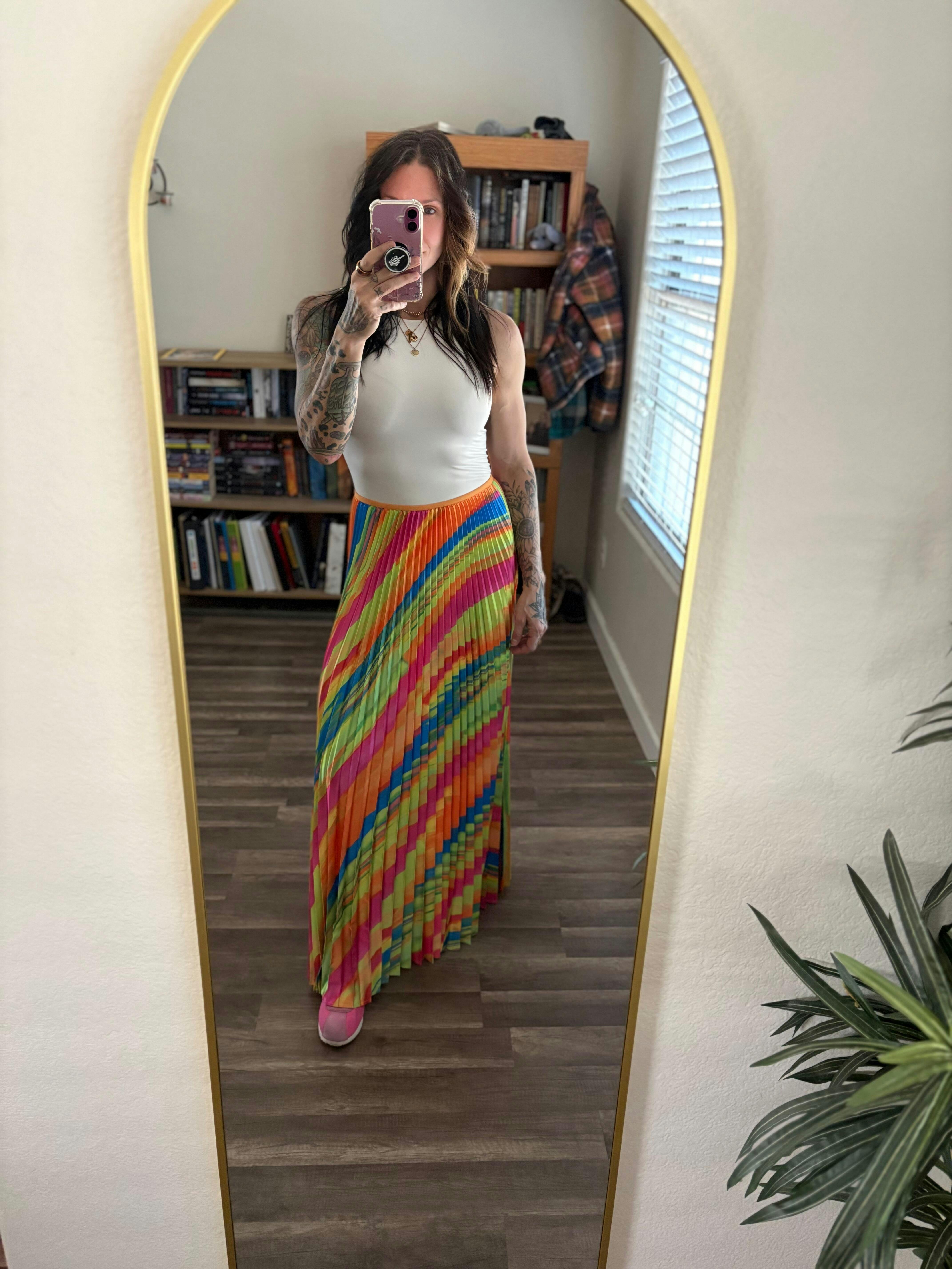 This skirt didn’t come to play by the rules. The Color Outside the Lines Pleated Skirt is bursting with bold, vibrant hues and flowy pleats that move with every step. Maxi length keeps it dramatic, while the color palette keeps it fun—basically, it’s wearable art.