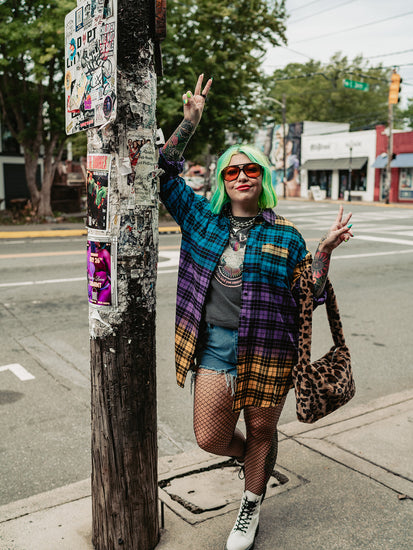 This isn’t your boyfriend’s flannel. It’s the one you thrifted and made cooler. Wear it open over a tee, buttoned with a mini skirt, or tied around your waist like it’s 1999 again.